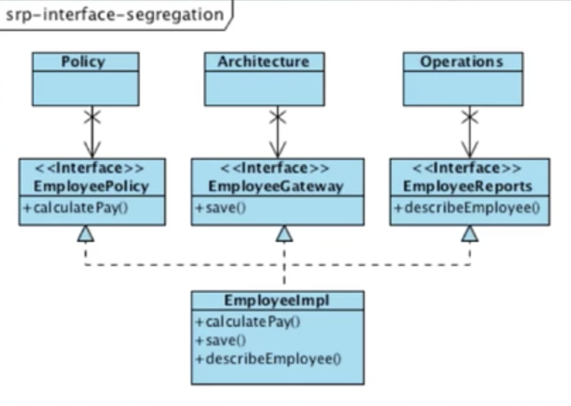 이후, EmployeeImpl(Employee 클래스)가 3개의 인터페이스를 구현 (또는 EmployeeImpl를 3개로 나눠도 됨) . 이를 통해 특정 액터에 의한 인터페이스 변경이 일어나더라도 다른 액터들은 영향을 받지 않게 됨.