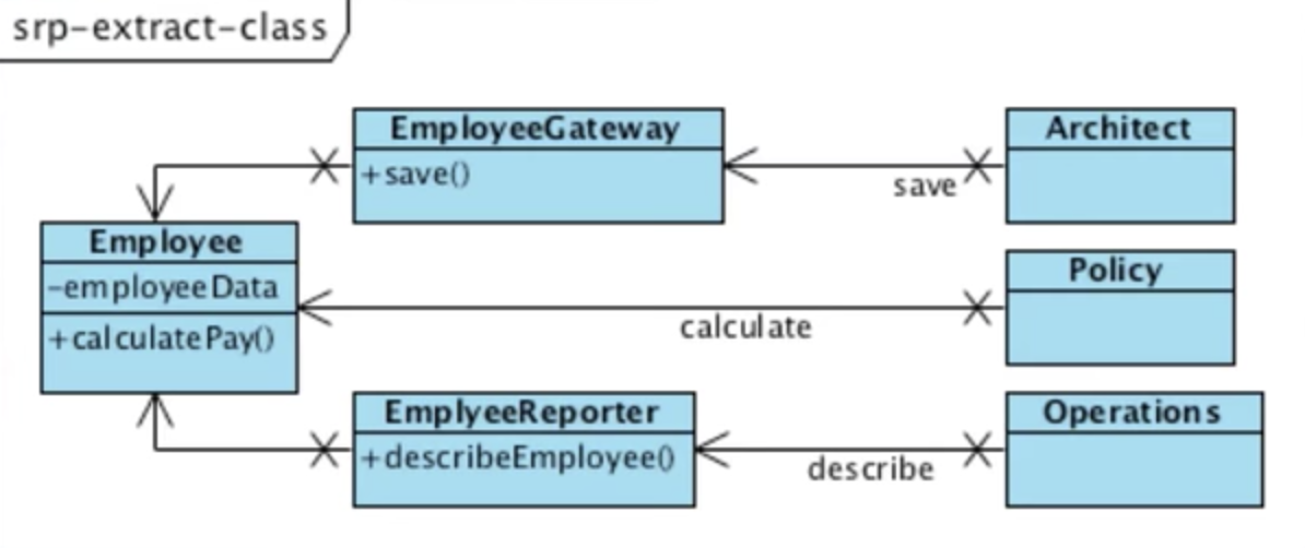 Operations Actor가 새로운 리포트 기능을 필요하다고 가정할 경우 새로운 리포트 기능도 Employee 클래스에 추가함. 기존 책임(Policy, Architecture)에는 변경이 없음에도 새로운 리포트가 추가되어 Employee 클래스가 변경.