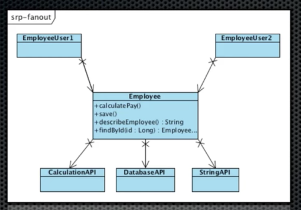 - 이는 변경에 민감하게 함.(Emplyee의 팬아웃으로 인해 사용되는 클래스에 의해 변경에 민감해진다. 하지만 여기서 던 큰 문제는 Employee를 사용하는 유저2개이다. 위두개는 Employee의 변경에 따라 더많은 변경이 생길 수 있다.)